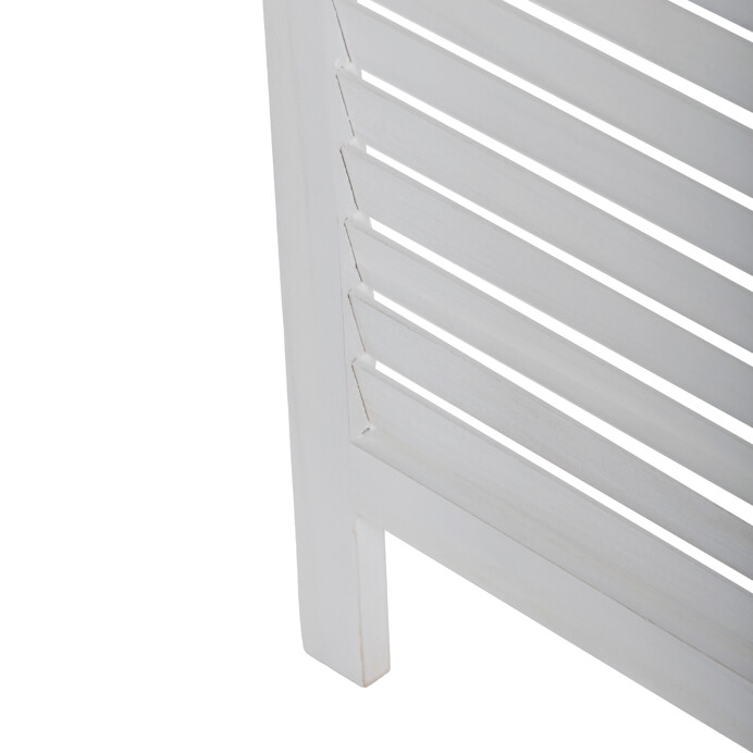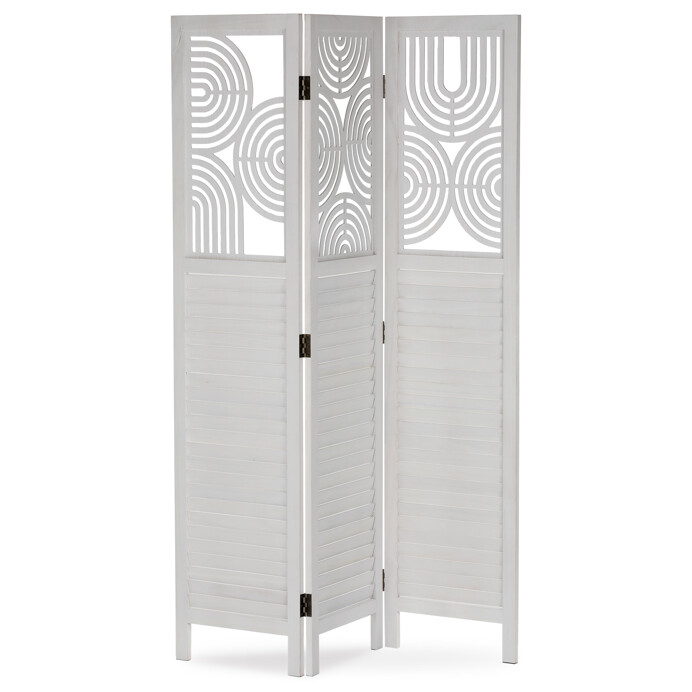 Trojdielny paraván vyrobený z masívneho smrekového dreva v bielej farbe ponúka praktické riešenie na rozdelenie priestoru v interiéri. Každý diel je doplnený dekoratívnymi výrezmi v hornej časti, ktoré prepúšťajú svetlo a zároveň zachovávajú súkromie. Masívny materiál zabezpečuje pevnosť a stabilitu, zatiaľ čo prírodná textúra dreva dodáva výrobku prirodzený vzhľad. Paraván je vhodný na použitie v obývacích izbách, spálňach alebo kanceláriách, kde pomáha vytvoriť útulné a funkčné prostredie. Vďaka skladacej konštrukcii je ľahko premiestniteľný a skladovateľný.