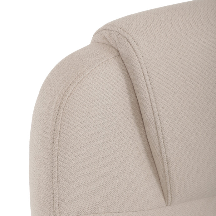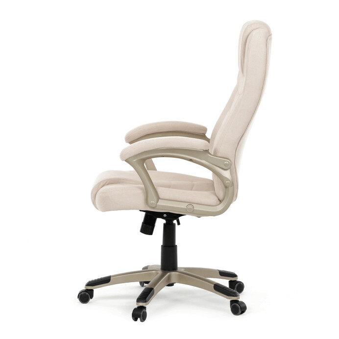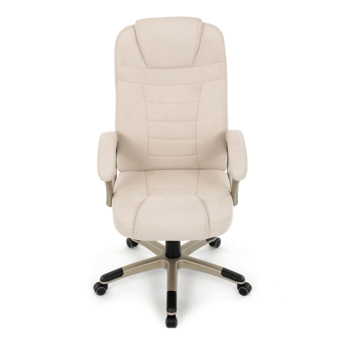 Kancelárske kreslo v béžovom prevedení kombinuje komfort s praktickým dizajnom vhodným na dlhodobé sedenie. Čalúnenie z kvalitnej látky zabezpečuje príjemný povrch a jednoduchú údržbu, zatiaľ čo pevné podrúčky s mäkkým polstrovaním podporujú pohodlie paží. Vysoké operadlo je doplnené pevnou opierkou hlavy s zmäkčenou vrchnou časťou, ktorá prispieva k lepšej podpore krčnej chrbtice. Hojdací mechanizmus umožňuje nastavenie polohy sedáku a výškovo nastaviteľná funkcia zabezpečuje ergonomické prispôsobenie používateľovi. Stabilná základňa z plastu v odtieni champagne je vybavená kolieskami vhodnými na tvrdé povrchy, čo uľahčuje mobilitu a zároveň chráni podlahu.