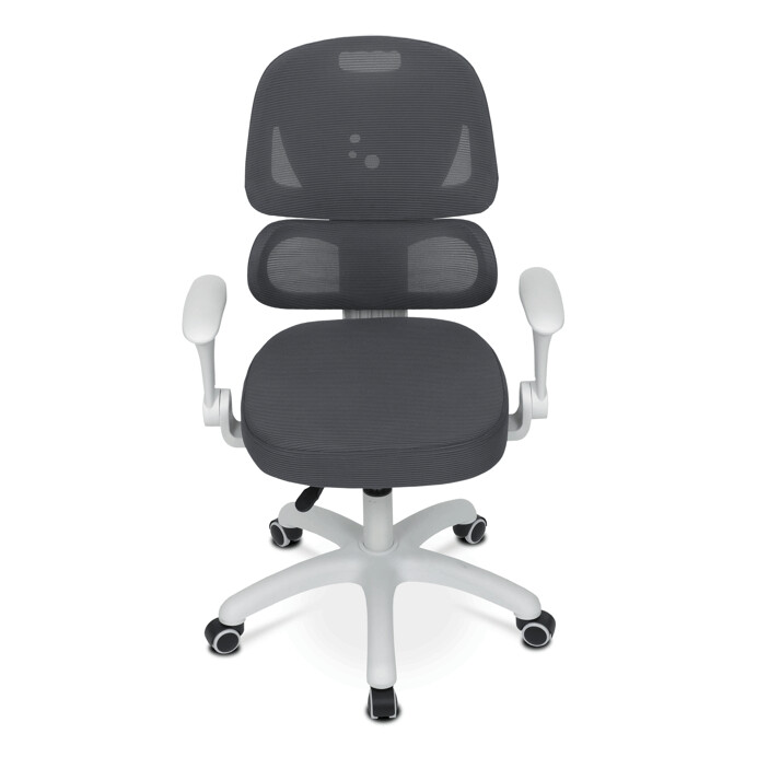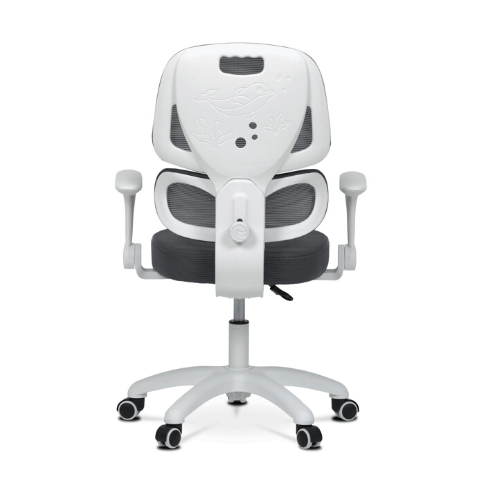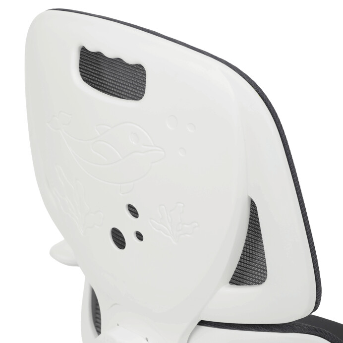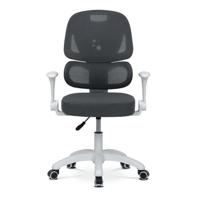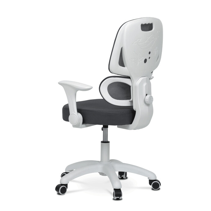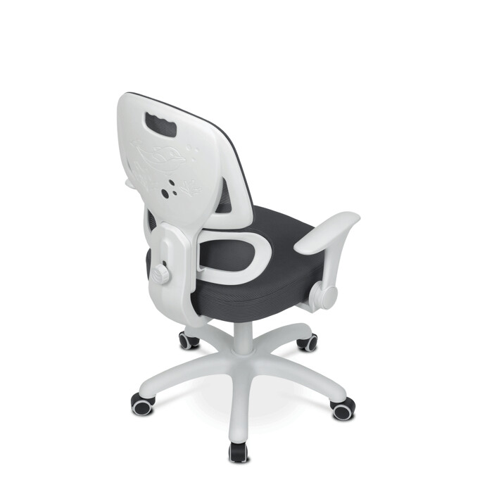 Detská stolička so sivou sieťovinou ponúka pohodlné a zdravé sedenie vďaka ergonomicky tvarovanej bedrovej opierke a výškovo nastaviteľnému operadlu. Sedák je potiahnutý priedušným materiálom, ktorý zabezpečuje optimálnu cirkuláciu vzduchu počas dlhého sedenia. Odklápacie podrúčky umožňujú jednoduché prispôsobenie priestoru a biely plastový kríž s kolieskami je určený na tvrdé podlahy, čo zaručuje stabilitu a ľahkú mobilitu. Mechanika umožňuje plynulé nastavenie výšky sedáka podľa potreby dieťaťa. Celkový dizajn podporuje správne držanie tela a komfort pri práci alebo hraní.