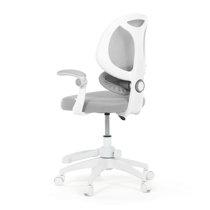 Detská kancelárska stolička v sivej sieťovine ponúka pohodlné a zdravé sedenie vďaka ergonomicky tvarovanému operadlu s nastaviteľnou bedrovou opierkou, ktorá podporuje správne držanie tela. Sedák je vyplnený mäkkou penou a potiahnutý priedušným materiálom, ktorý zabezpečuje cirkuláciu vzduchu počas dlhšieho používania. Odklápacie podrúčky umožňujú jednoduché prispôsobenie priestoru a lepšiu manipuláciu so stoličkou. Plastový kríž v bielej farbe je vybavený kolieskami vhodnými na hladké povrchy a zaisťuje stabilitu aj mobilitu. Výškovo nastaviteľný mechanizmus umožňuje individuálne nastavenie výšky sedáka podľa potreby dieťaťa.