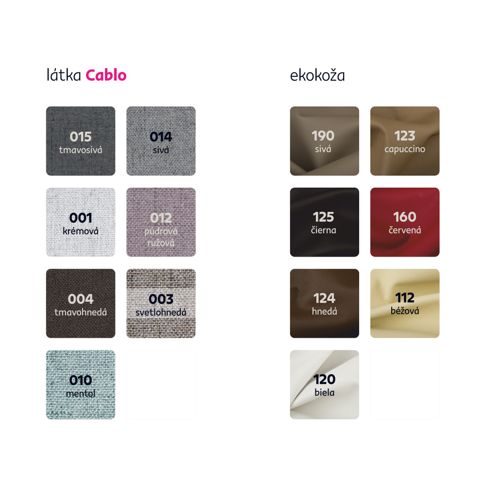 Máme pre vás hneď sedem farieb látky Cablo a sedem farieb ekokože, kombinovať teda môžete podľa ľubovôle. Odtiene nájdete v priloženom vzorkovníku. Výber farebného odtieňa poznačte pri objednávaní priamo do poznámky. Pri individuálnej objednávke je potrebné zaplatiť 20% zálohu z danej sumy. Po uhradení zálohy bude Vaša požiadavka zadaná do výroby. Doba dodania 6-8 týždňov. Cena takto zloženej sedačky v inej farbe závisí od počtu jednotlivých dielov, ktoré ju tvoria. Odporúčame preveriť si konečnú cenu.
