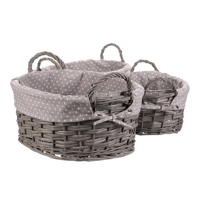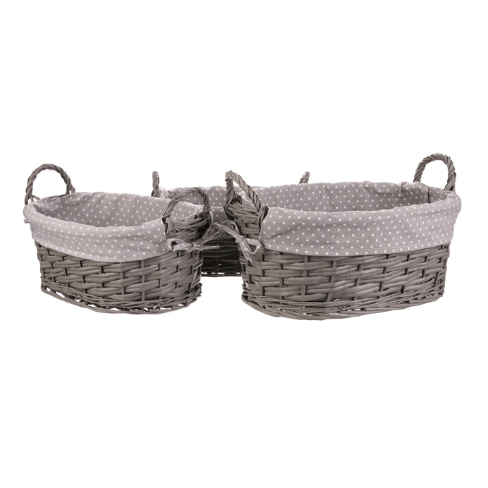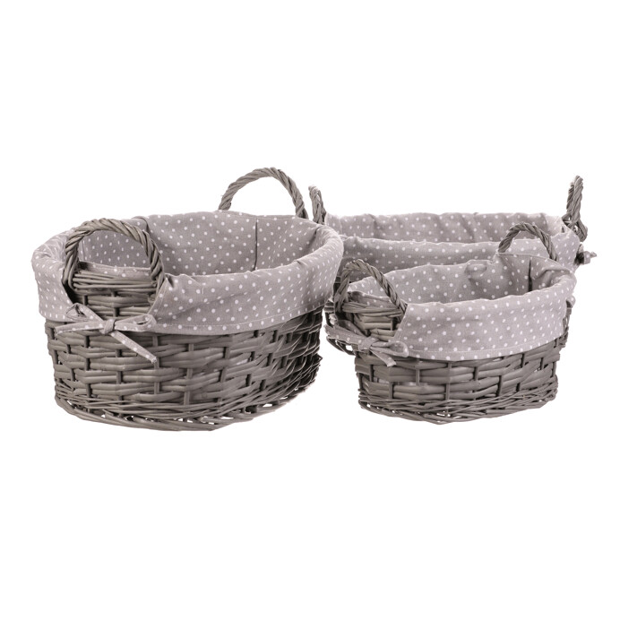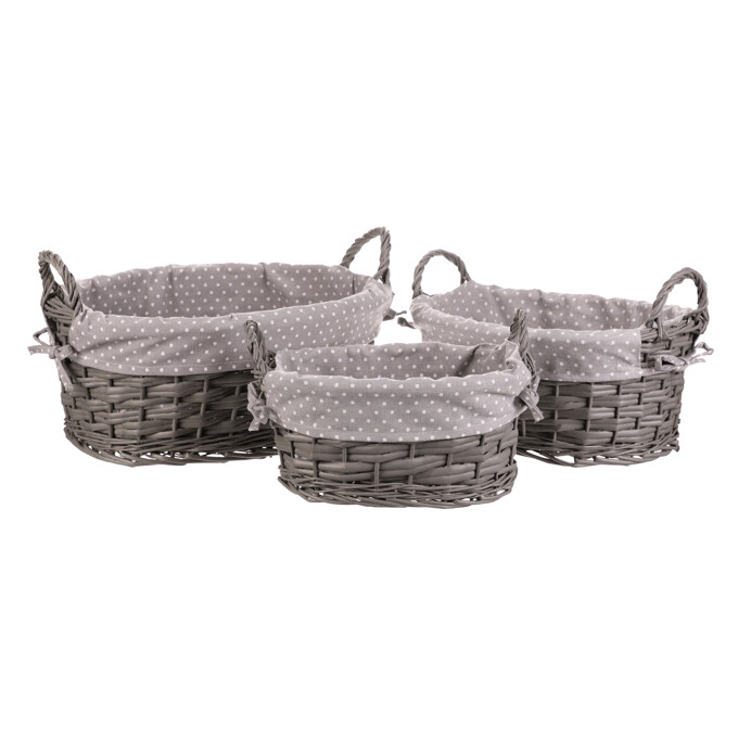 Kôš prútený - oválny, s látkou, sivý, cena za sadu 3 ks