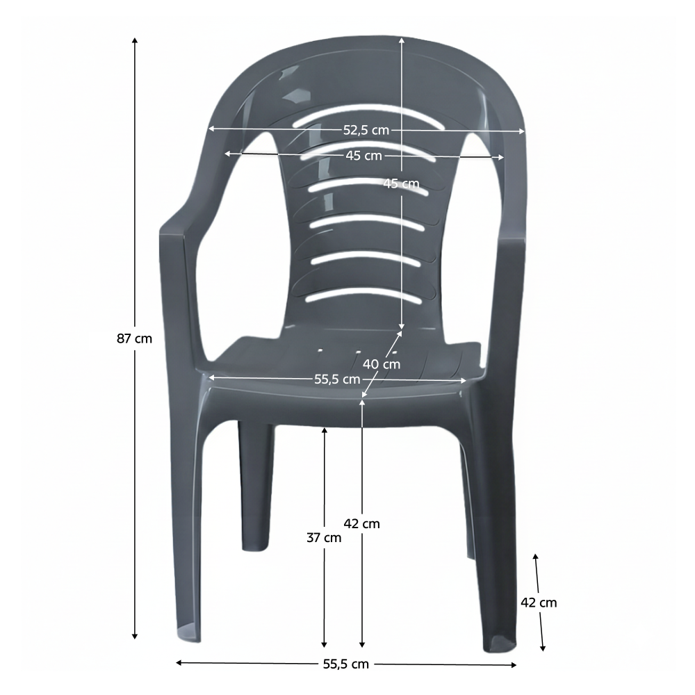 Materiál: plast Farba: antracit Rozmery (ŠxHxV): 55,5x42x87 cm Výška sedu: 42 cm Hĺbka sedu: 40 cm Šírka sedu:55,5 cm Šírka chrbta: 45 cm Výška chrbta: 45 cm Nosnosť: 100 kg Otvory na odtok vody Stohovateľné Ľahké skladovanie Záhradné Dodávané v monte